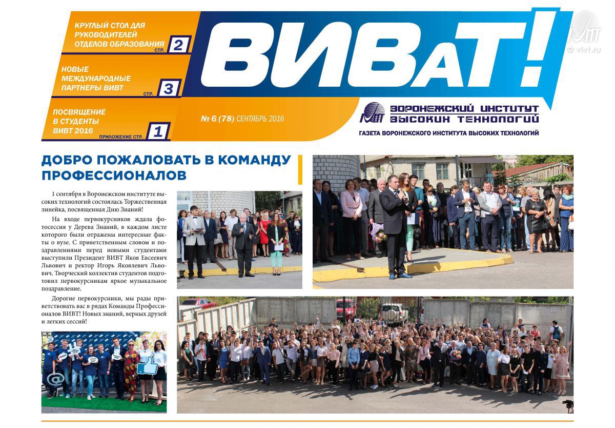 20 октября 2016 г. в Воронежском институте высоких технологий прошла беседа в читальном зале библиотеки ВИВТ со студентами первого курса по теме «Жизнь и творчество В.А. Кораблинова (1906-1989)», посвящённая 110-й годовщине со дня рождения писателя. Беседу провела Галина Викторовна Вишина, кандидат педагогических наук, доцент, ведущий научный сотрудник Воронежского областного литературного музея им. И.С. Никитина.26-29 сентября 2016 г. в Государственном музее Аушвиц-Биркенау (г. Освенцим, Республика Польша) состоялся образовательный семинар «Аушвиц – история и символика». В результате переговоров проректора ВИВТ по международным отношениям Натальи Тимофеевой с заместителем директора Государственного музея Аушвиц-Биркенау и руководителем Международного центра образования об Аушвице и Холокосте Анджеем Кацоржиком было принято решение о расширении сотрудничества, возможности школьных обменов и группового студенческого волонтариата на двухсторонней и трехсторонней основе.